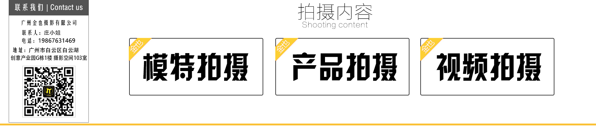 廣州金也攝影有限公司 聯系人:莊小姐 電話:19867631469(微信) 地址:廣州市白云區白云湖創意產業園G棟1樓 攝影空間103室 |